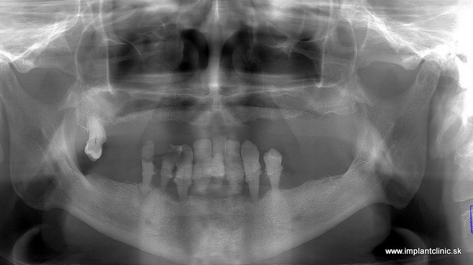 Komplexné ošetrenie bolo potrebné aj u nášho pacienta Ladislava. Nemal žiadne zuby vo vrchnej čeľusti a v sánke mu zostalo už len málo nefunkčných zubov.