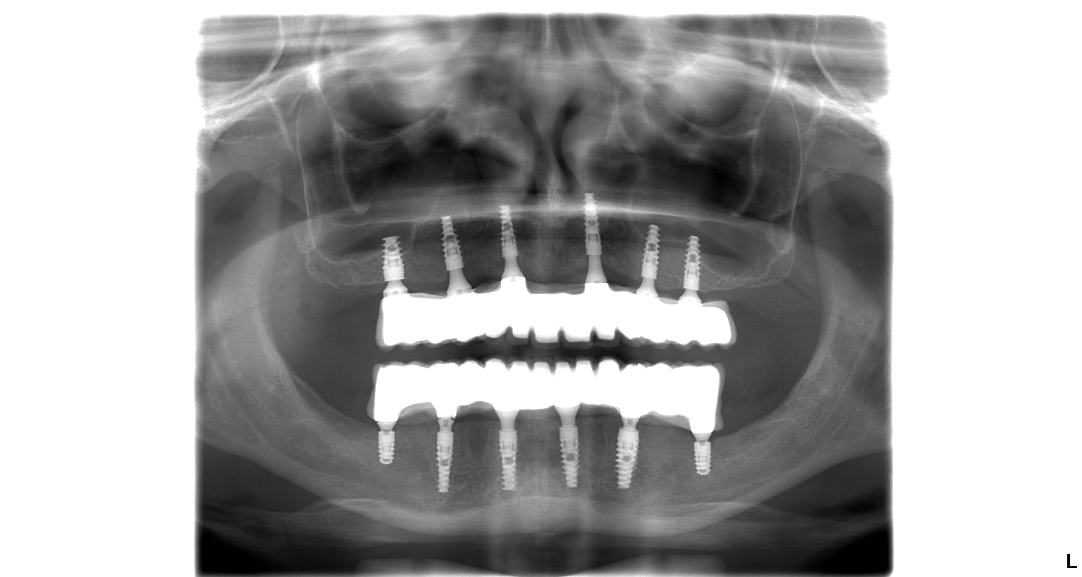Pacientka Eva podstúpila implantáciu hornej a aj spodnej čeľuste v celkovej narkóze. Vo vrchnej čeľusti pacientka nosila snímateľnú protézu, ktorá vzhľadom na jej vek nebola dobrým riešením. Preto sa rozhodla pre radikálnu zmenu. A ako napísala v dotazníku po ošetrení bola veľmi spokojná s finálnym výsledkom.