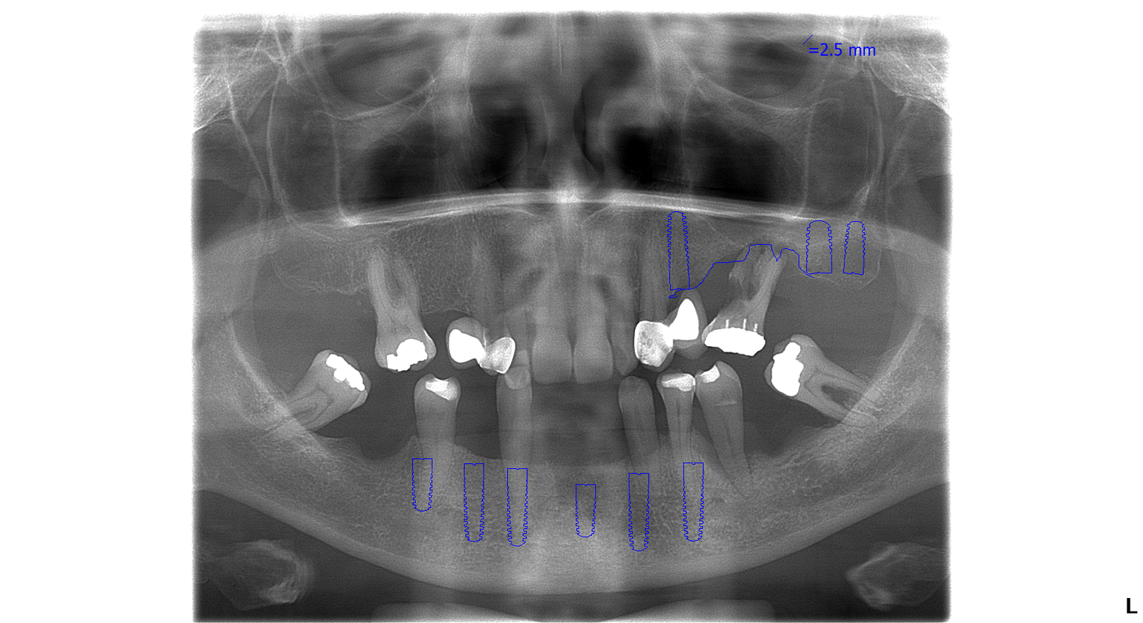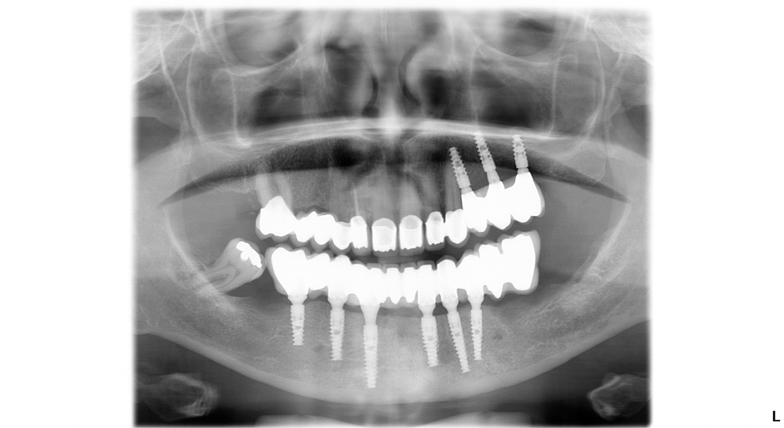 vrchná čeľusť: 3 zubné implantáty, sinus lift, 8 zirkónových koruniek, 1 endodoncia – ošetrenie koreňových kanálikov