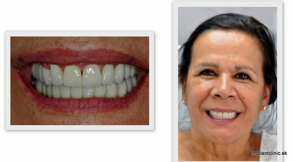 Po zahojení zubných implantátov, ktoré trvalo tri mesiace sa pacientka vrátila na kliniku a začalo sa s vrchnou čeľusťou. Pacientke bola urobená endodoncia – ošetrenie koreňového kanálika. Zuby sa obrúsili do požadovaného tvaru a pripravili sa na nasadenie koruniek. Nasledovalo odobratie odtlačkov zubných implantátov a obrúsených zubov. Výroba zubných koruniek v zubnom laboratóriu trvala tri týždne. Posledná návšteva pacientky na klinike bola na nasadenie trvalých koruniek. Ponúkame Vám fotografie pacientky po ukončení ošetrenia a snímky pred a po ošetrení.