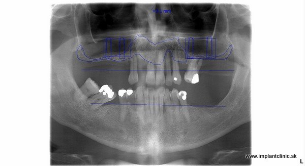 Druhá návšteva: implantácia. Z dôvodu oslabenej čeľustnej kosti sa naplánovalo do vrchnej čeľuste 9 zubných inplantátov, 6 zubných implantátov do sánky, dostavba kosti, sinus lift, extrakcie. Implantácia do oboch čeľustí prebehla počas jedného sedenia v lokálnej anestéze. Hneď po implantácii boli pacientovi nasadené fixne dočasné mostíky, ktoré sú pre maximálnu stabilitu a pevnosť vystužené titánovou konštrukciou.