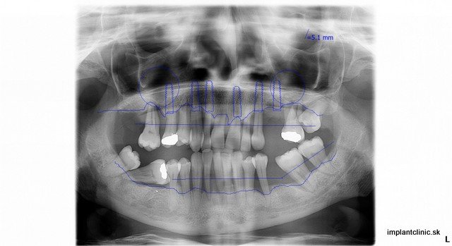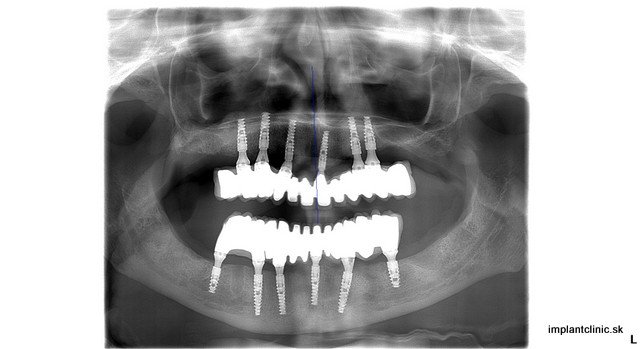 Naša pacientka Pavla mala ešte všetky svoje zuby, no tie z hľadiska dlhodobej prognózy už nebolo možné ponechať. Preto boli všetky zuby extrahované. Hneď po extrakcii sa na vrchnú čeľusť a sánku zaviedlo po 6 zubných implantátov. Implantáciu vykonal náš hlavný implantológ MUDr. Marek Salka.