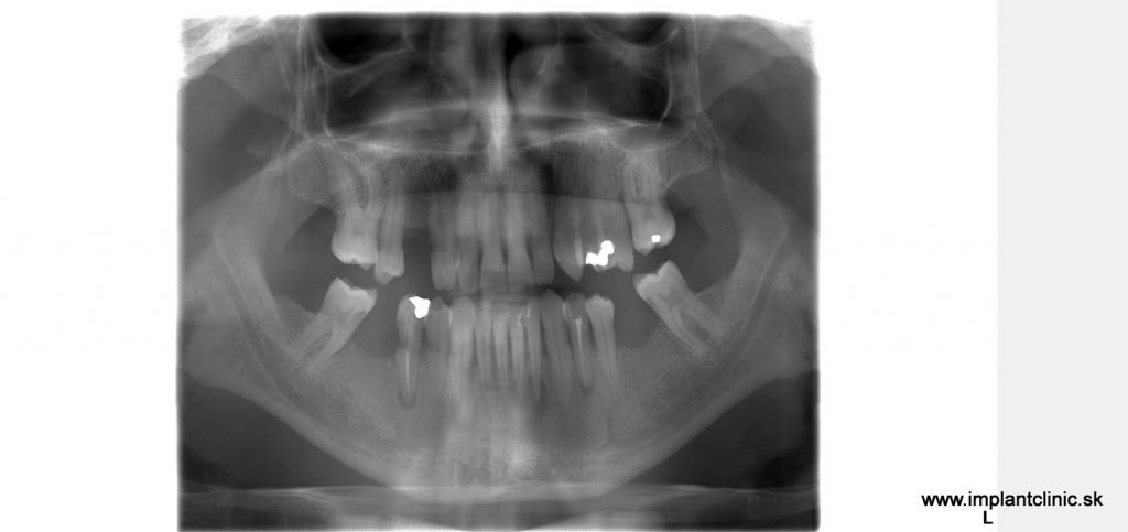 Tento pán prišiel s narušenou žuvacou funkciou. Po konzultácii s implantológom sme navrhli plán: zaviedli sme 6 zubných implantátov a nasadili 14-členný mostík do oboch čeľustí. Ošetrenie sme rozdelili na dve sedenia, aby sme zabezpečili pohodlie a plynulý priebeh.