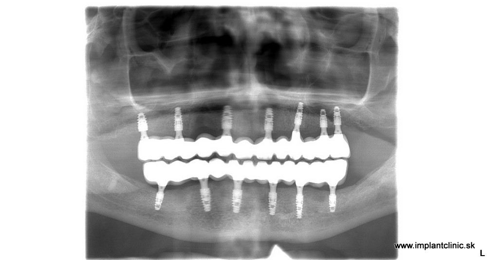 Michal sa objednal na konzultáciu v Implantclinic. Náš hlavný implantológ MUDr. Salka navrhol komplexnú rekonštrukciu chrupu hornej čeľusti a sánky. Konkrétne sa jednalo o zavedenie 7 zubných implantátov v hornej čeľusti a 6 zubných implantátov v sánke.